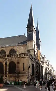 The facade on Rue Saint-Denis is distinguished by two high towers, but the rest of the exterior is difficult to see because of the narrow streets. The outer aisles of the nave and choir were added later, and probably replaced earlier external buttresses. The apse of the church was considerably shortened in the 19th century and three chapels were removed to make space for the new boulevard built by Napoleon III.[8]