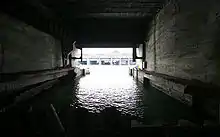 The base offers 14 submarine pens. Pens 1 through 8 are dry docks, 92 m (302 ft) long and 11 m (36 ft) wide; pens 9 through 14 are simple docks, 62 m (203 ft) long and 17 m (56 ft) wide, each holding two submarines.