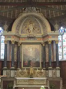 The centerpiece of the choir is the black marble, polychrome wood, gilded high altar. It dates from 1712 and occupies almost the entire space between the two doors.[19] The pediment features Christ in Majesty.[20] The altar box, in painted wood, ronde-bosse-style (in the round, free standing), is decorated with a Paschal lamb and two bas-reliefs.[19] The one on the left, inspired by Leonardo da Vinci, represents the Last Supper, and the one on the right the maundy.[20] The five-sided gilded wood[20] tabernacle is framed by four columns that define the niches containing the statues.[19] The altarpiece is set back under a wide cornice and canopy supported by six black marble columns topped with Corinthian capitals.[19]