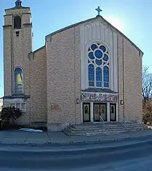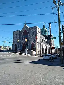 Saint Anne Church, formally the Shrine of Saint Anne for Mothers, is a Roman Catholic church located in the South End neighborhood of Waterbury, CT, part of All Saints Parish (Spanish: Todos Los Santos). Saint Anne Parish was founded in 1886 to serve city's the French-Catholic population. For nearly 100 years, two 100 foot steeples served as a prominent Waterbury landmark; however, due to ongoing structural problems, the spires were carefully removed in 2019 and stored for possible reconstruction.