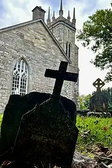 In the porch there is an oar from the life boats of the sunken RMS Lusitania. Adjacent to the church, there is a small graveyard where the mass grave of the Lusitania victims is located[1] and where, among others, the novelist Edith Somerville who lived and died in Castletownshend, and who was an organist at the church,[8] is buried. So is her long-term literary partner Violet Florence Martin, with whom she formed the literary duo Somerville and Ross.[9] To fulfil Edith Somerville's wish to be buried next to her partner, rock had to be blown up in the churchyard, which anecdotally was done with the help of IRA's explosives.[10]