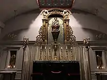 In 2019, two mosaics were added to the church, flanking the organ. The mosaics, produced by Italian mosaic studio Ferrari & Bacci, depict the communion of saints.[20] Eventually, there are plans to add further art on the 32 other panels that circle the church.[21][22] The mosaics are constructed by the Italian company Barsanti of Pietrasanta, and are made of Venetian glass.[23] They are based on paintings by Venezuelan-Italian realist Ramiro Sanchez, whose work has previously been displayed at the nearby Muscarelle Museum of Art.[24][25]