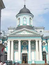 Private stables of Empress Elizabeth of Russia stood on its location in the mid-18th century,[2] until it was granted to Petersburg Armenians on May 2, 1770 by Empress Catherine the Great, upon the request of her Armenian jeweler Ivan Lazarev.[4] Its construction was primarily financed by Lazarev,[2][5] who provided 30,000 rubles of the total 33,000.[6] The church was designed by Yury Felten[4][2] and is an early example of Russian Classicism.[2] Its construction began in the spring of 1771[1] and was completed in 1776.[7] The church was consecrated on February 18, 1780 by Hovsep Arghutian (Prince Argutinsky-Dolgorukov), the archbishop of the Russian diocese of the Armenian church, in attendance of Prince Grigory Potemkin, the favourite of Catherine the Great.[4][3] It is named after Catherine of Alexandria, a namesake of the empress.[8] Colored white and blue, it has a neoclassical portico and single cupola.[9]