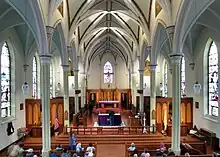 Fenwick left St. Joseph Church in 1821 when he was appointed as bishop of the newly formed Diocese of Cincinnati. Fr. Young carried on alone until 1823 when Fr. Daniel O'Leary joined him at St. Joseph and remained with him there until the mid-1830s. During that time, the log church was replaced with a brick one; it was dedicated on Jan. 11, 1829. In time, this structure became too crowded, so construction on another church building began in 1839. Despite funding difficulties, the church (the current St. Joseph church building) was completed and dedicated in 1843.[5][6] All but the walls was destroyed by fire in 1864, but the church was rebuilt. The interior was renovated in 2016.
