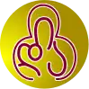 The trefoil of the Girl Guide membership badge is made of the letters d-i-a in the Georgian alphabet, stylized to look like an adult embracing children.