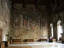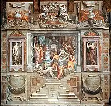 The Sala dei Cento Giorni ("Room of 100 Days") is the largest reception room, the Salone d'Onore on the piano nobile, of the Palazzo della Cancelleria or Chancellery in Central Rome, Italy. The frescoes by Giorgio Vasari and his studio in 1547, epitomize the Mannerist style. Supposedly they were completed in a hundred days.