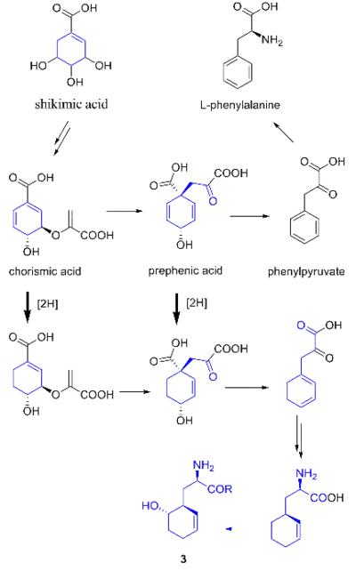 Proposed biosynthesis of the nonproteinogenic amino-acid beta-hydroxycyclohex-2'-enylanine (3) (R = H or S~PCP) via a shunt in the phenylalanine biosynthetic pathway