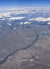 Spread across approximately 2,103 square miles (5,450 km2) with 871 square miles (2,260 km2) in the state of Idaho, the Salmon Falls Creek basin drains portions of Elko County in Nevada and Owyhee and Twin Falls County in Idaho. Much of the southern portion of the watershed is part of the Basin and Range Province of northern Nevada, while the lower watershed is characterized by the basalt plateau of the Snake River Plain.[6] As a whole, the entire Salmon Falls Creek watershed is very arid. Much of the basin receives less than 10 inches (25 cm) of rain annually, while the mountainous areas may get up to 30 inches (76 cm). Rainfall in the mountains provides most of the perennial flow into Salmon Falls Creek Reservoir, while springs from the Snake River Aquifer also provide some water.[7]