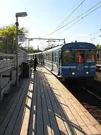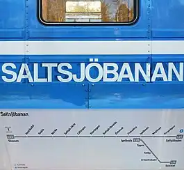 Saltsjöbanan is an electrified suburban rail system between Stockholm and Saltsjöbaden in Nacka, Sweden. It is 18.5 kilometres (11.5 mi) in length and has eighteen stations in use. An average of 17,200 boardings are made on an ordinary workday (2019).[2] The line is mostly single-track (with passing loops between Nacka and Saltsjö-Järla, and between Storängen and Saltsjö-Duvnäs), and is isolated from Sweden's national railway network, although both are built to compatible 1,435 mm (4 ft 8+12 in) standard gauge. The Storstockholms Lokaltrafik (SL) classifies it as "light rail" in its maps.[3]