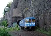 A train (C11) on Saltsjöbanan entering Stadsgården tunnel. At lower left is the former track towards Stockholm South, now paved over a few dozen metres from this point.