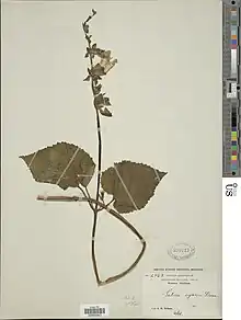 Salvia cynica is a perennial plant that is native to Sichuan province in China, growing in forests and streamsides at 1,500 to 3,200 m (4,900 to 10,500 ft) elevation. The leaves are broadly ovate to broadly hastate-ovate or subcircular, ranging in size from 5 to 20 cm (2.0 to 7.9 in) long and 3 to 18 cm (1.2 to 7.1 in) wide.