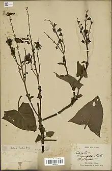 Salvia funckii is a perennial shrub native to Colombia, growing on rocky slopes in cloud forest from 2,000 to 2,800 m (6,600 to 9,200 ft) elevation. The plant grows up to 3 m (9.8 ft) tall, with decumbent or ascending stems, and triangular-hastate leaves. The blue flowers are 2.5 to 3 cm (0.98 to 1.18 in) long.[1]