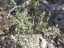 Salvia thymoides is an upright plant that reaches 1 foot (0.30 m) tall and wide, with grey-green 0.25 inches (0.64 cm) leaves that are evergreen and profusely cover the plant. The 0.5 inches (1.3 cm) flowers are purple-blue, and held in a tiny dark purple calyx, growing on whorls that are held on a short inflorescence that is 2 inches (5.1 cm) long.[1]