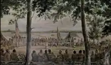 Seymour joined a scientific expedition to explore the Missouri River in 1819. He, along with Titian Peale, were the first trained artists to explore the western frontier and capture scenic landscapes and Native Americans.[16] There were also the "first official artists to accompany a United States government" expedition of the Great Plains.[17] He was with Major Benjamin O'Fallon when he met with Missouria, Otoe, and Pawnee tribes. Among his works was a watercolor that he made of a Pawnee council that included a military party of officers and a band. In it, Pawnee are seated on benches, an American flag flies from a pole, and a Native American leader stepped forward to speak to the audience.[18]
