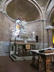 Also at this church, it is said that in 1376, Saint Catherine of Siena was able to force a reconciliation of a bitter feud between the Maconi and Tolomei/Rimaldini families. With the feuding parties present, she entered into a trance like extasis while in prayer at an altar.