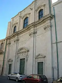 This new church was rebuilt after the 1693 Sicily earthquake, standing next to the former Interlandi palace, with its broad rounded portal, asymmetrically placed on the facade.[1] The two story facade is framed by echoing doric pilasters and a protruding first floor cornice. The portal tympanums are comprised by triangles, and a semicircular central tympanum. There is a sparsity of sculptural decoration, except for the whimsical masks and sireneic caryatids around the central portal, with windows reserved for the second story. Just lateral to the upper left corner of the central portal, there is a small lizard carving, a signature insignia of the architect Vermexio, who also worked on Santa Lucia extra moenia and Santa Lucia al Sepolcro. The interior has an roughly oval interior, with a white sandstone floor with floral dark basalt inlays. The interior layout and decoration is attributed in part to the architect Rosario Gagliardi.