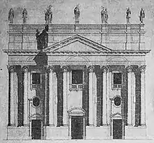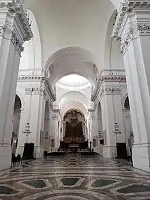 The construction of this church begun in 1687, using designs of Giovanni Battista Contini, was interrupted by the profound effects of the 1693 Sicily earthquake. Reconstruction began in the 17th-century under different architects, including Francesco Battaglia and Stefano Ittar, but the facade was never finished, and presently has a surreal appearance with half-complete columns, and riddled with holes meant to hold affix marble facing. The dome was completed in 1796 by Ittar. The wide interior has massive pilasters and three naves. The main altar is surrounded by wooden choir stalls for the monks; the latter were carved by Nicolò Bagnasco. The main organ, still functioning was completed by abate Donato del Piano.