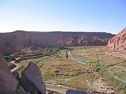 Salado River has its source at the Aguada Puripica and flows south for 43 kilometres (27 mi)[1] until it merges with the Grande River to become the San Pedro River. From its origin, San Pedro River flows 12 kilometres (7.5 mi)[1] south to the town of San Pedro de Atacama. From there the river follows a barely distinguishable delta-like course.