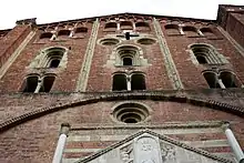 The façade is marked by two buttresses that divide it into three zones, corresponding to the internal naves; the buttress on the right, more often, houses an internal staircase that allows access to the roof. The top is crowned by a blind loggia and a motif with intertwined arches. The stone (sandstone) is used only for the most important parts, such as the portal and the windows. The portal, in sandstone and marble, bears, within the tympanum, the figure of San Michele in the center, flanked on the sides by the images of two prayers. These sculptures probably come from the previous basilica, since they are dated to 1050-1090. Along the buttresses there are traces of an ancient narthex, or perhaps a quadriporticus, which preceded the entrance to the church.[14]