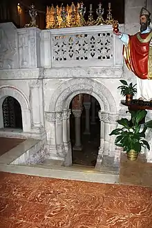The basilica remained the main sepulchral church of the Visconti court in Pavia until the foundation of the Certosa: between 1384 and the beginning of the 15th century, Francesco d'Este, the eldest daughter of Gian Galeazzo and Caterina Visconti, Violante Visconti and the condottiero Facino Cane.[7] Also in the same years, the basilica was visited by diplomats and ambassadors visiting the court of Galeazzo II, such as Geoffrey Chaucer in 1378.[8] In 1525 the Landsknechte captain Eitel Friedrich III, count of Hohenzollern and Richard de la Pole, pretender to the English crown, who died during the battle of Pavia, were also buried in the basilica.[9][10]