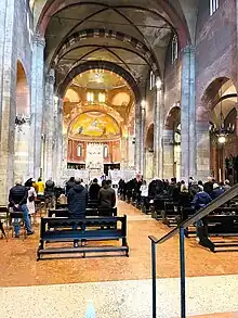 In the 1570s, in compliance with the dictates of the Council of Trent, the numerous sarcophagi and funeral monuments that crowded the basilica were removed, also creating a certain embarrassment during liturgical functions. With the exception of the remains of king Liutprand, most of the mortal remains found during the 19th-century restorations were buried below the main nave, near the penultimate pillar before the crypt, as recalled by an epigraph inserted in the floor.[11]
