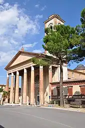 The present basilica is an exceedingly eclectic assembly of elements from different eras. The facade alone has a Romanesque portal, Gothic rose window, and Neoclassical pronaos. The church structure was significantly damaged during the earthquake of 2016.