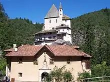 The original church, built at the highest point of the rock, the oldest of the present churches, is dedicated to San Nicolò, and was built around the year 1000 over the tomb of Saint Romedius,[4] with stones carried all the way up by generations of pilgrims. This church also features a colossal Romanesque portal and a Madonna and child giving a blessing (12th century). The relics are preserved in a shrine of 1120. The cult of Saint Romedius was officially recognised by the Church in 1300. Devotion to the saint increased greatly in the 15th century, when the sanctuary was crowded by many pilgrims bringing ex voto's.[2]