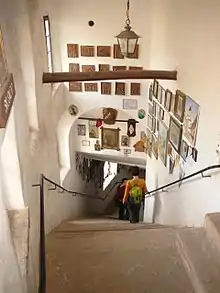 Inside the sanctuary are kept many ex voto's of artistic interest of the 15th, 16th and 17th centuries. The oldest church has frescoes of the Madonna and Child, the Last Supper and a series of angels and saints. The chapel of St. George has frescoes in the vault depicting the Doctors of the Church and the symbols of the Four Evangelists. In the church of St. Michael above the altar is a 16th-century altarpiece showing the Archangel Michael driving Lucifer back to Hell. In the larger church of Saint Romedius the altarpiece shows the hermit himself with the bear on a leash, while the frescoes on the walls depict the Twelve Apostles, the Annunciation and the Assumption.[2]