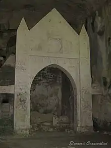 The small chapel is remarkable for being partially carved into the cliff and having Romanesque elements. The entrance is now walled up but has a rounded portal of decorated travertine marble. A round window is above the entrance. The interior, partially vandalized with graffiti has a peculiar stone altar shelter.[2]