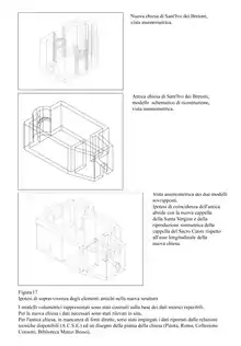 The hypothesis[4] that the elements of the ancient church walls have been retained in the new construction, which consists of buildings and the new church, is founded. The maintenance of the old apse, would coincide with the current chapel of the Blessed Virgin (Santa Vergine). Some considerations in support of this hypothesis relate to the form of the new church. The persistence of the masonry structure of the apse, with its proportions, would have affected the plan and the elevation development. The 90 ° rotation of the axis of the church (necessary for obtaining a building of smaller dimensions in the same lot), would have required the construction of a symmetric chapel, equally great.