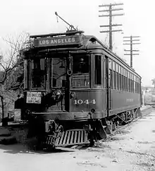 Installation of the railway electrification system on the line had begun by May 1908,[5][6] and electric service to the Hill Street Terminal began that July (cars ran to Hill Street via the Venice Short Line).[7] Limited flyer service was inaugurated on May 26, 1909.[8] Pacific Electric bought the line in 1911, along with all the other lines owned by Los Angeles Pacific. Tracks between Culver Junction and Amoco Junction were electrified in 1912, allowing cars to reach downtown via the Watts Line.[9] The Santa Monica harbor Long Wharf was closed to shipping traffic in 1913.[10][11][12] By 1923, service consisted of 17 daily round trips to 11th Avenue, 15 round trips to Culver City, and a single daily round trip the full length of the line to Santa Monica.[13]