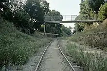 After abandonment, ownership was maintained by Southern Pacific,[3] which leased various portions of the land for semi-permanent structures. By the mid-1990s parking lots, storage facilities and some retail buildings had almost completely covered the tracks west of Sepulveda Boulevard — with unused signal cantilevers and crossing gates being the only clue to its former existence. East of Sepulveda Boulevard, tracks, bridges and tunnels remained intact but overgrown.