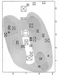 The site is flanked by two large pyramidal mounds in what appears to be a general east–west orientation.[11] Interestingly, unlike other sites in the region, there doesn't seem to be any formal or planned layout of the site.[12] Mound A at the eastern end of the site stands 11 meters (36 feet) tall, and Mound W is at the western end at 14 meters (46 feet) tall.[13] In the center of Santa Rosa is a large platform approximately 6 meters (20 feet) high, and 74 meters (243 feet) wide by 80 meters (260 feet) long.[14] Located to the north and south of the site are what appear to be clusters of possible elite residential platforms.