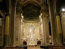 The ceiling of the central nave has a Vision of San Gaetano (1667) by Angelo Michele Colonna and Giacomo Alboresi. The second altar on the right has a San Carlo Borromeo at the cemetery of Varallo (1614) by Ludovico Carracci. The 4th altar on right has an Annunciation (of the Beautiful Angel) (1632) by Francesco Albani and he also painted the lateral wall frescoes (1633) depicting a Nativity and Dream of Joseph. In the ceiling of transept is depicted a Glory of San Stefano (1695) by Giovanni Antonio Burrini and Marcantonio Chiarini. The apse has a depiction of the Martyrdom of San Bartolomeo and Two Miracles of the Saint, 1685 frescoes by Marcantonio Franceschini and Luigi Quaini. The cupola (1691) was decorated by Giuseppe and Antonio Rolli. The chapel of the left transept has a Beato Paolo Buralli (1772) by Ubaldo Gandolfi and a small Madonna with sleeping Jesus (1632) by Guido Reni.[1]