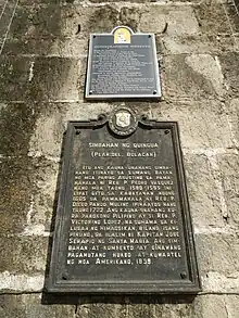 The church of Plaridel, or Quingua was first established as one of the visitas of Malolos in 1581 and Fray Mateo Mendoza OSA who administered the Malolos Convent began the Christianization of Encomienda Binto y Quingua. It was located in a barrio now called "Lumangbayan" the mission chapel was soon transferred to its present location across the river Quingua (now known as Angat River) because of frequent flooding. Due to long distance of Malolos Convent to the Visita of Binto making the friars to be physically exhausted, the Augustinian prior of Malolos Fray Roque de Barrionuevo made the elevation of Visita of Binto into a Quasi-Parish on September 27, 1602. On April 30, 1605, Quingua was officially established as a full pledge Parish with Fray. Diego Pardo OSA as its first parish priest under the advocacy of Santiago de Matamoro. A Church was built on the new location starting 1602 and took 15 years to complete. The adobe stones used in the church were from the town of Meycauayan while the bricks used were made at Sitio Nabugtos at Brgy. Sta. Ines. In the year 1612, Quingua already had its own convent and 1,800 parishioners. It is said that the parish was not as wealthy as other convents in the Provincia de Bulacan during that time and that it was exempted from its fees to the Augustinian Province in the Philippines located at the San Agustin Church, Intramuros, from 1640 to 1704. The 1605 church was razed by fire after being hit by lightning. As a result, in 1722 a new church was built by Fr. Tomas Quijano on the same site. In 1772, the church was razed by fire once more but was quickly rebuilt. During the British Invasion in the 18th century, some of the treasures and documents owned by the San Agustin Monastery in Intramuros were transferred to the convent of Quingua. The church suffered immensely from an earthquake in 1863 but was repaired the same year.[1] According to the historical marker installed by the National Historical Committee, the church also served as a military hospital and cuartel by the Americans in 1899.
