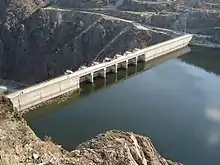 Sarıyar Dam is a dam 23 kilometres (14 mi) north of the town of Sarıyar in the Nallıhan district of Ankara Province. It is 125 kilometres (78 mi) west of the city of Ankara, the central Anatolian capital of Turkey. It is also located 60 kilometres (37 mi) upstream of Gökçekaya Dam on the Sakarya River, which runs into the Black Sea. It was completed in 1956. The total power output from the hydroelectric facility is 160 MW (four facilities of 40 MW each).