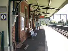 The Platform 1 (west) building is a gabled face brick building with an awning on the east (Platform) side, corrugated steel roofing and a skillion corrugated steel roof to platform awning. The building has no chimneys. Gable ends feature rectangular timber louvred vents. Walls feature sandstone reveals and sills to windows and sandstone door reveals, and a sandstone corbel at door header height. There is a corrugated steel screen added to the north end of the building. The building features timber framed double hung windows with 9-paned top sashes with coloured glass panes to most. The awning is cantilevered on steel brackets mounted on decorative sandstone brackets. Doors are timber flush with 6-paned fanlights with coloured glass panes.[2]