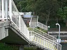 A set of modern concrete stairs accessing the south end of Platform 2 from the First Street overbridge.[2]