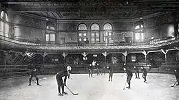 The Schenley Park Casino was Pittsburgh’s first multi-purpose arena. The facility was considered the envy of the sports and entertainment world during the early 1890s, with amenities that were unsurpassed anywhere on the globe. It was built at the entrance to Schenley Park in Oakland near the Phipps Conservatory, the Schenley Bridge and the Carnegie Library of Pittsburgh.[1] The University of Pittsburgh’s Frick Fine Arts Building currently sits on the site of the casino.[2] The casino was the first place in Pittsburgh where organized ice hockey was played. The arena's artificial ice surface was the first of its kind in North America.[3]