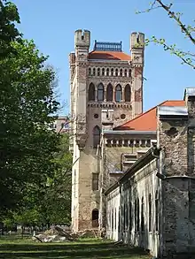 The main wing is now being reconstructed since it was in almost fatal condition. The wing is a two storied residence with one dominating feature – a four storied tower on the west side. The whole wing escalates from the bottom to the top. The plinth is simple stone work, just as the first floor. The windows have rectangular shape, but apparently used to have a pointed arc on the top. The cornice dividing the first and the second floor is also rustic and minor. While on the second floor, the windows are decorated with a simple edicule without any tympanon. The windows are united by another plain cornice. The chateau does not have a whole entablature, only the cornice and an arc-shaped frieze with added blind circle windows.
