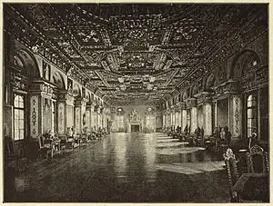 Inside the south wing overlooking the Bodensee, the Knights' Hall (German: Rittersaal) was constructed between 1580 and 1584, one of the most magnificent ballrooms of the late German Renaissance.[1][4][5] The room is, together with the knight's hall in Schloss Weikersheim, one of the few surviving state rooms of this time.[1] The richly carved coffered ceiling hanging from the roof structure was created by Jörg Schwartzenberger from Meßkirch.[1][2] The chimney structures on the sandstone chimneys on the narrow sides with niche and column figures were created in 1584 and probably come from Hans Morinck.[1]