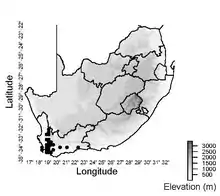 Most collections of Schoenus gracillimus have been from damp sites in the mountains of Western Cape Province.[1] However, some collections have been made from elevations near sea level.[1]