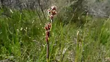 Schoenus villosus, known as the hairy bog-rush, is a species of sedge native to Australia. A tufted perennial grass-like plant growing from 15 to 40 cm tall. The stem is grooved, 1.2 to 1.7 mm wide. Found near the coast or nearby ranges in Queensland and New South Wales. Growing in heath or woodland, on sandy soils. The specific epithet villosus is derived from Latin, meaning "hairy". One of the many plants first published by Robert Brown with the type known as "(J.) v.v." Appearing in his Prodromus Florae Novae Hollandiae et Insulae Van Diemen in 1810.[1][2]