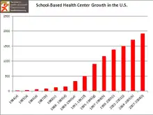 In the past 40 years, school-based health centers have grown from a handful to 1,909 in 45 states.[13][14] The initial survey in 1985, conducted by the Center for Population Options (now known as Advocates for Youth), reported 35 centers nationwide.[15] Follow-up surveys by The Center for Health and Health Care in Schools (previously known as the Making the Grade National Program Office ) continued to document SBHC growth through the 1990s and early 2000s.[16][17] Since the late 1990s, the National Assembly on School-Based Health Care (NASBHC) has conducted a nationwide census of individual centers tri-annually, every 3 years.
