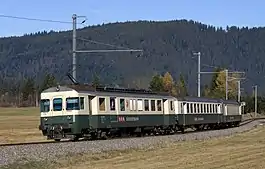 ABe 4/4 5 (formerly CFZe 4/4 12) power car with a passenger train in Biberbrugg.