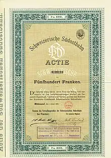 Original share of the Swiss Southeastern Railway worth 500 francs from 1 January 1890