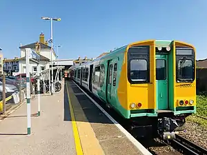 Seaford railway station is in Seaford, East Sussex, England. It is the terminus of the Seaford branch line of the East Coastway line, 58 miles 77 chains (94.9 km) measured from London Bridge.[1] The line to the station has been reduced to a single track and only one platform remains in use (previously two), though it is still numbered platform 2. Platform 1 is still visible but the track has been removed.