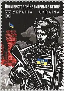 A 2020 stamp of Ukraine dedicated to the fifth anniversary of the battle. It reads: They withstood [the attacks]!! Concrete didn't!!