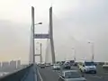 The Second Wuhan Yangtze River Bridge (Chinese: 武汉长江二桥, Wuhan Changjiang Er Qiao) is a bridge across the Yangtze River in Wuhan, Hubei province, China. It is located northeast (downstream) of the historic central area of the city's Hankou District and is the northern crossing for the Inner Ring Road. It is a cable-stayed bridge built of pre-stressed concrete, and has a central span of 400 metres (1,300 ft).[1] It is 4.678 kilometres (2.907 mi) in length (including the 1,876-metre (6,155 ft) main span) and is 26 metres (85 ft) wide. Its main bridgeheads are 90 metres (300 ft) high each, pulling 392 thick slanting cables together in the shape of double fans, so that the central span of the bridge is well-balanced on the piers and the bridge's stability and vibration resistance are ensured.