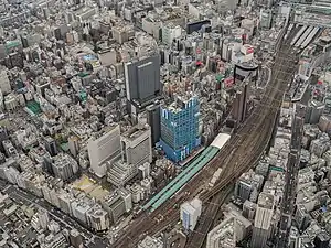 The station is located approximately 420 meters (460 yards) by foot from Shinjuku Station.[2] It is part of the Shinjuku Prince Hotel and Seibu Shinjuku PePe shopping complex, with the ticket machines and platforms located on the second-floor level. The main entrance is located at the southern end, and a smaller "North entrance" is located at the north end of the station.